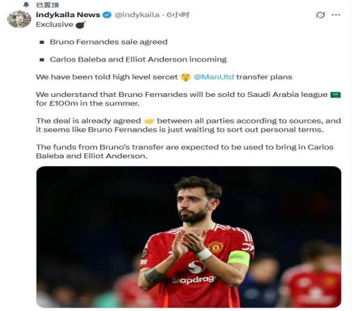 來自indykaila News的獨家消息透露,曼聯(lián)已經(jīng)和沙特聯(lián)賽的球隊達(dá)成協(xié)議,以1億英鎊的價格出售曼聯(lián)隊長布魯諾費爾南德斯,也就是B費,目前雙方已經(jīng)達(dá)成協(xié)議,B費在等待個人條款的處理,曼聯(lián)將會把這筆轉(zhuǎn)會費投入到巴萊巴和埃利奧特的引援上。indykaila News也就是大家俗稱的“綠帽哥”,是著名的轉(zhuǎn)會自媒體,在今年夏窗報道了維爾茨等人的轉(zhuǎn)會消息得到了不少認(rèn)可。